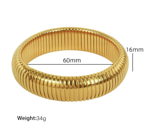 Aureliaβ’ | Dames Goudkleurige Spiraalarmband | Brede Glanzende Stretch Armband met Sculpturale Ribstructuur