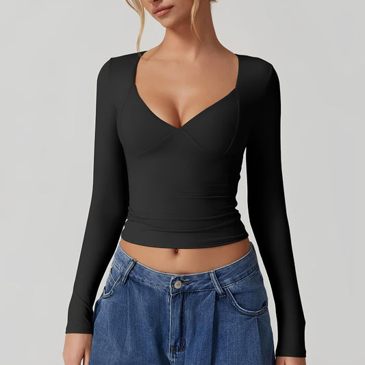 Maelis™ | Dames Top met Diepe Hals en Strikdetail | Stretchy Longsleeve met Flair Mouwen