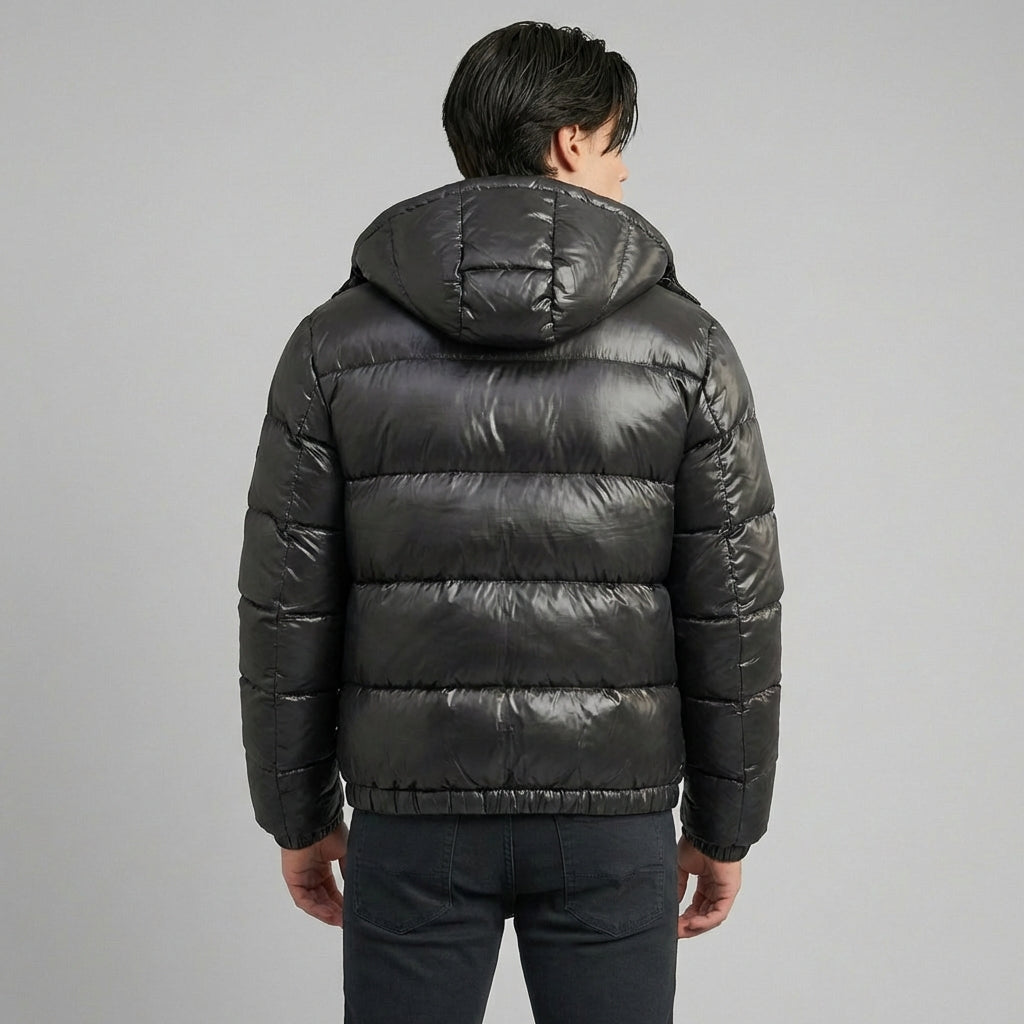 Vous cherchez une doudoune homme élégante qui s’accorde parfaitement à vos tenues quotidiennes ? Cette veste matelassée présente une coupe compacte à la longueur des hanches avec des bandes horizontales et une capuche fixe. L’extérieur légèrement brillant et la silhouette moderne font de cette courte veste d’hiver un choix idéal pour un look urbain contemporain pendant les saisons fraîches.