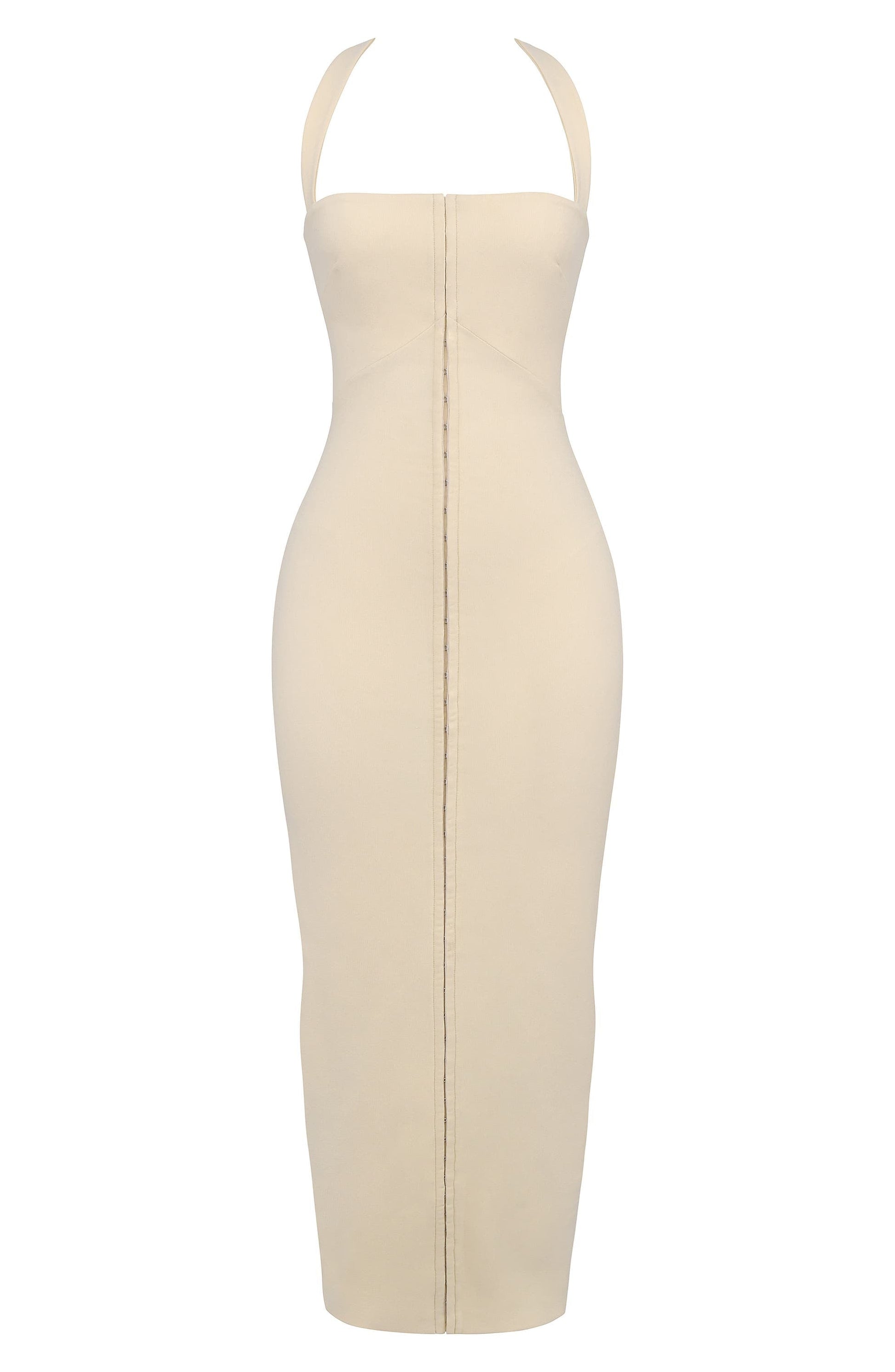 De Alessia Lange Halterjurk in crème (ook verkrijgbaar in zwart) combineert minimalisme met verfijnde sensualiteit. Het nauwsluitende ontwerp accentueert de vrouwelijke vormen, terwijl de halterneklijn de schouders en halslijn prachtig benadrukt. Het verticale naad- en ritsdetail voegt een moderne touch toe aan deze tijdloze klassieker.