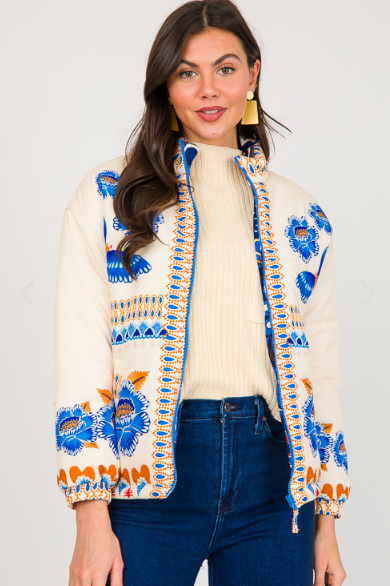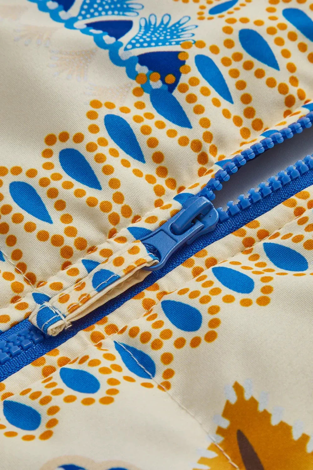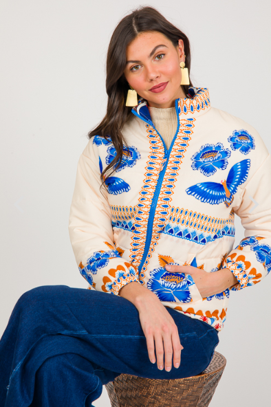De Althea jas brengt kleur en persoonlijkheid in je garderobe. De luchtige, gewatteerde structuur met blauw-oranje bloemenprint op een crèmekleurige basis geeft dit stuk een kunstzinnige, boho uitstraling. De lichte oversized pasvorm en elastische boorden zorgen voor optimaal comfort, terwijl de verfijnde details langs rits en kraag een ambachtelijke charme toevoegen.
