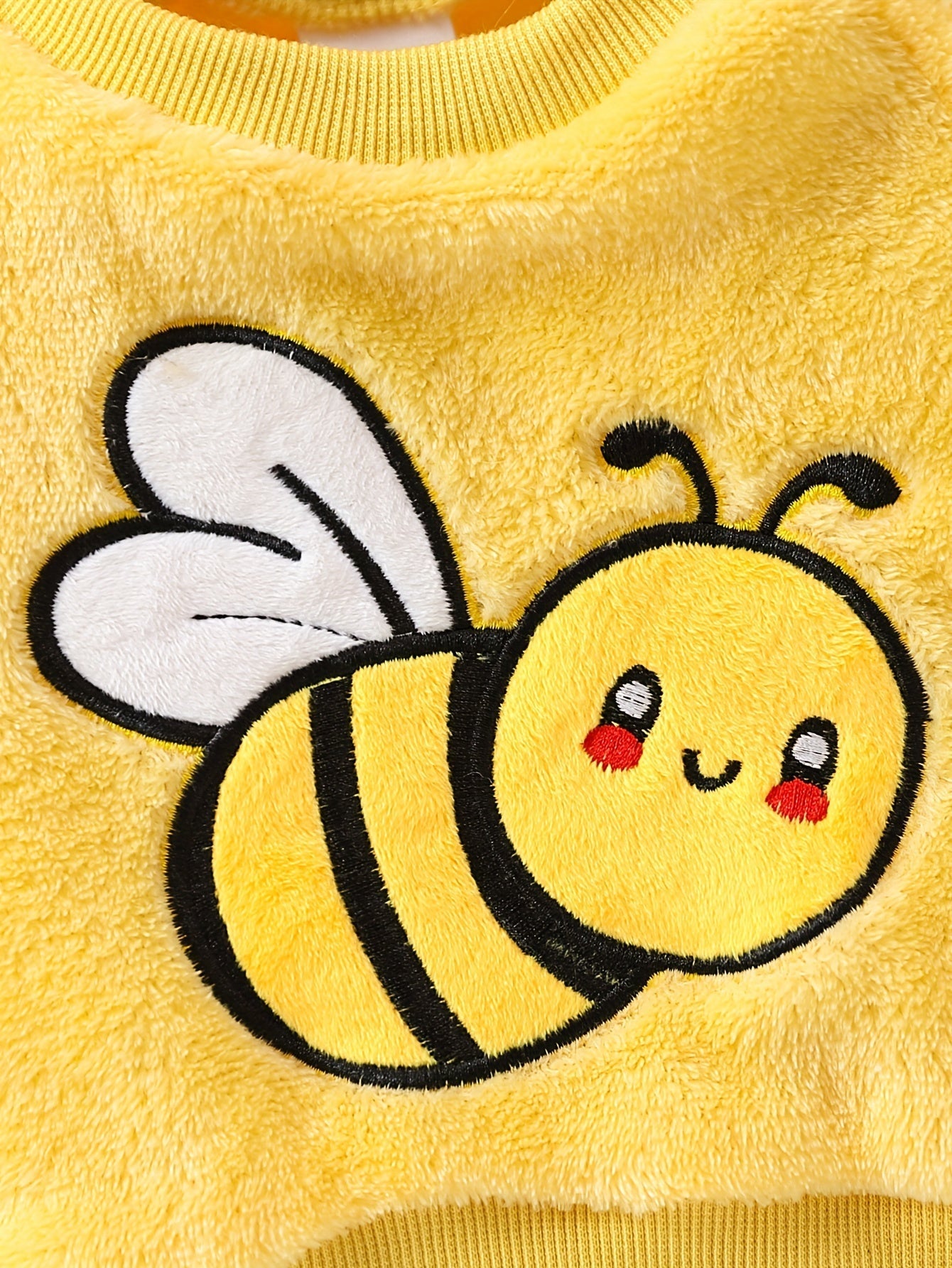 Met deze 3-delige pluche baby set krijgt jouw kleintje direct een complete, vrolijke look. Het zachte pluche materiaal voelt heerlijk knuffelig aan en de gele bijenprint maakt de outfit extra speels. Perfect voor koude dagen in de herfst en winter, zowel thuis als buitenshuis.