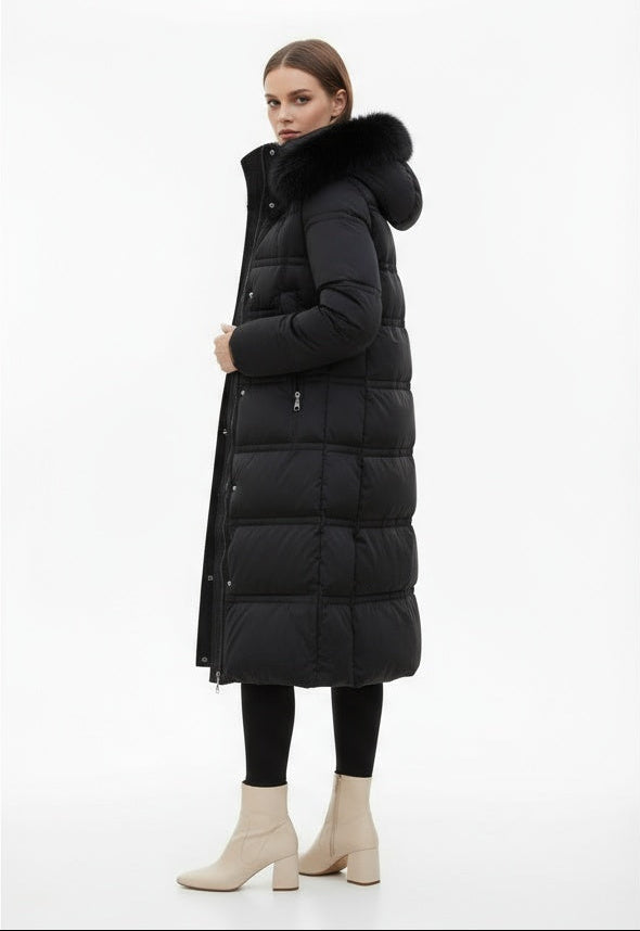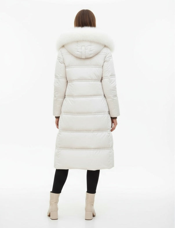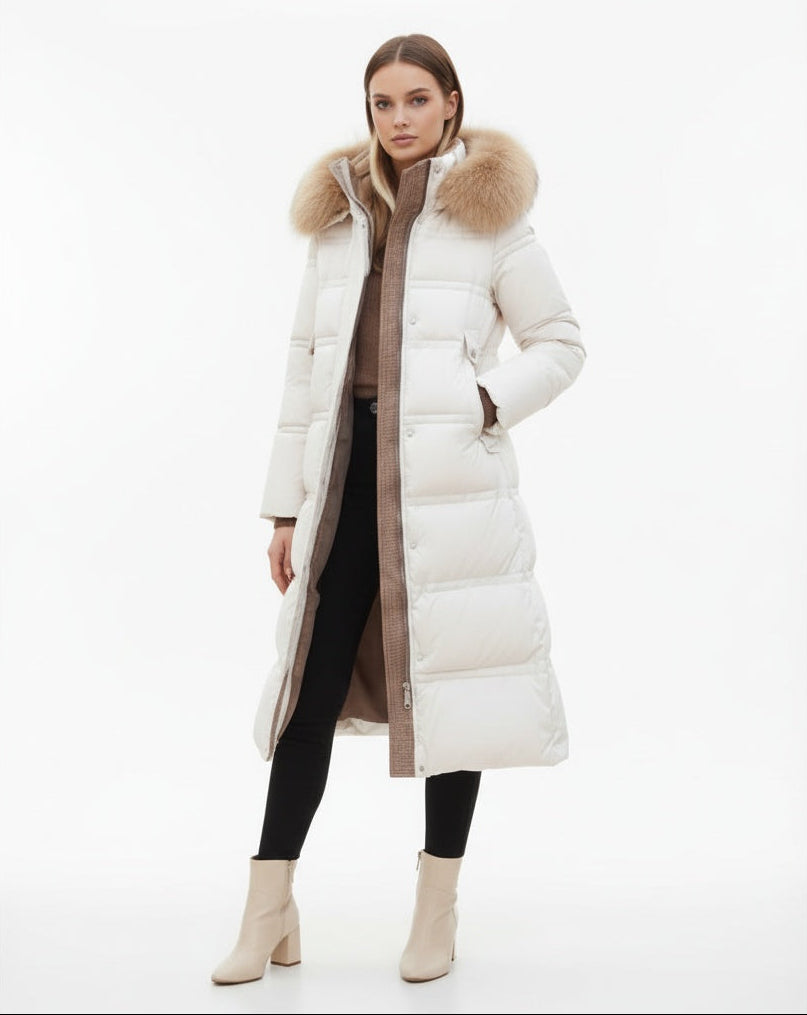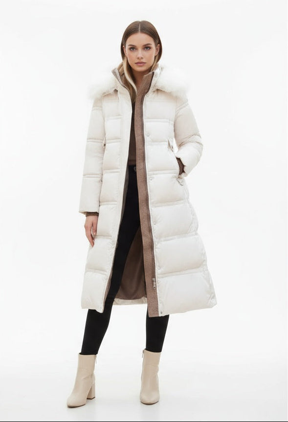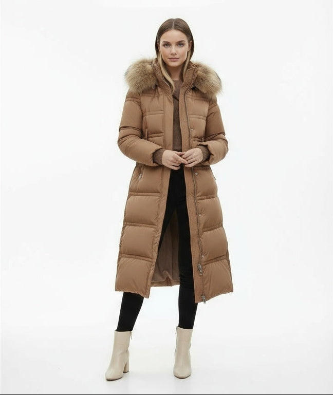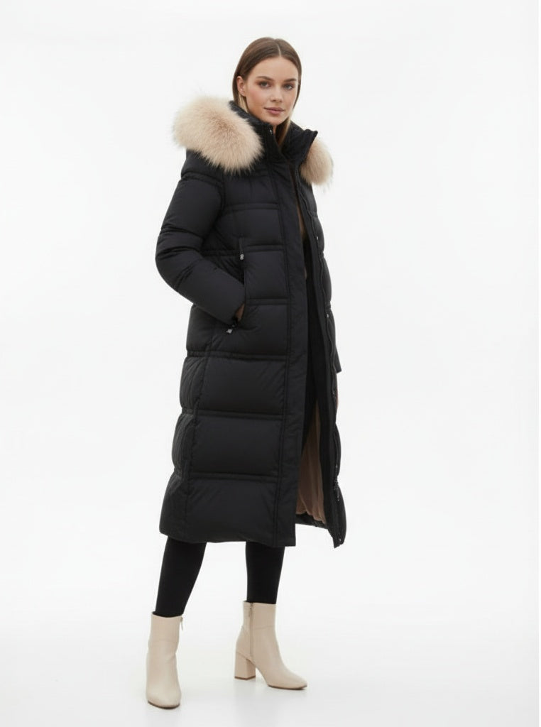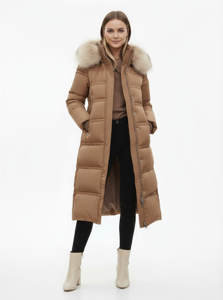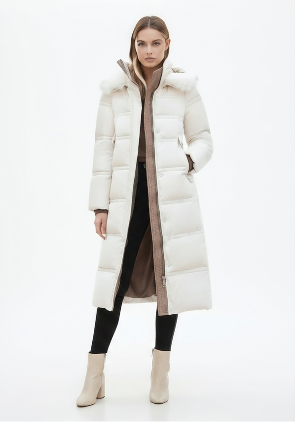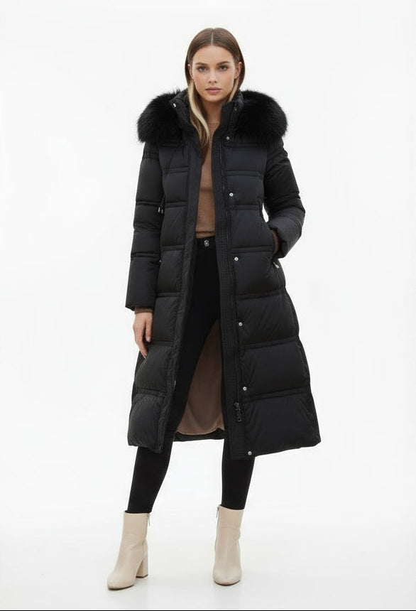 Deze lange winterjas biedt maximale warmte en bescherming, terwijl de elegante pasvorm je figuur mooi accentueert. Dankzij de pufferstijl, capuchon en luxe bontkraag combineert deze jas functionaliteit met een verfijnde uitstraling.