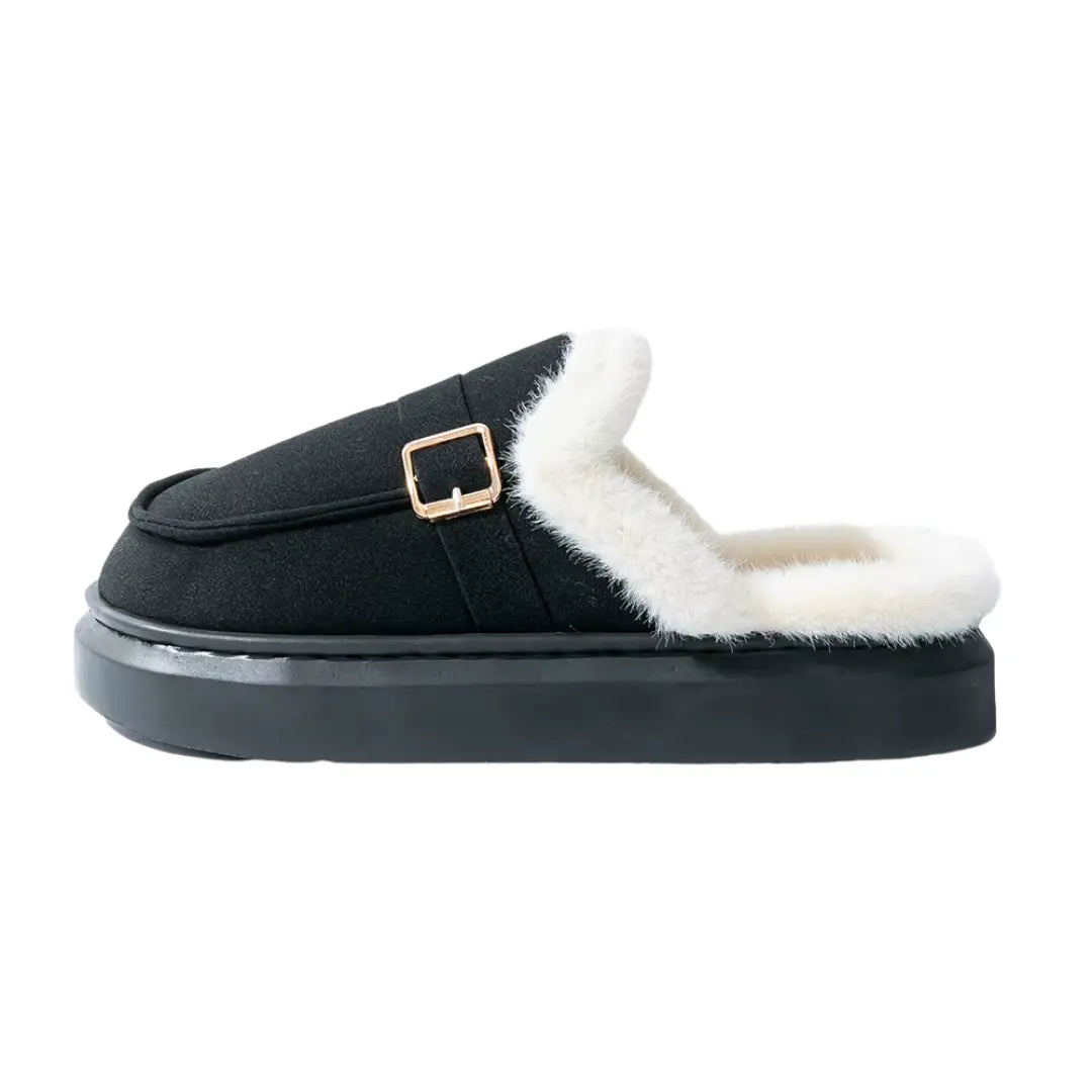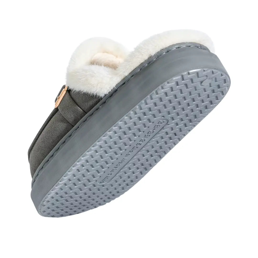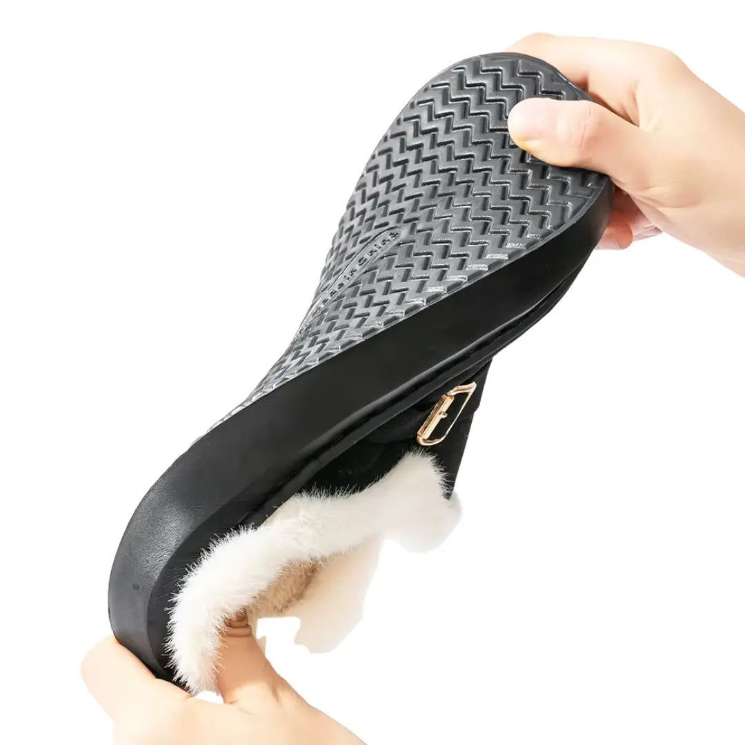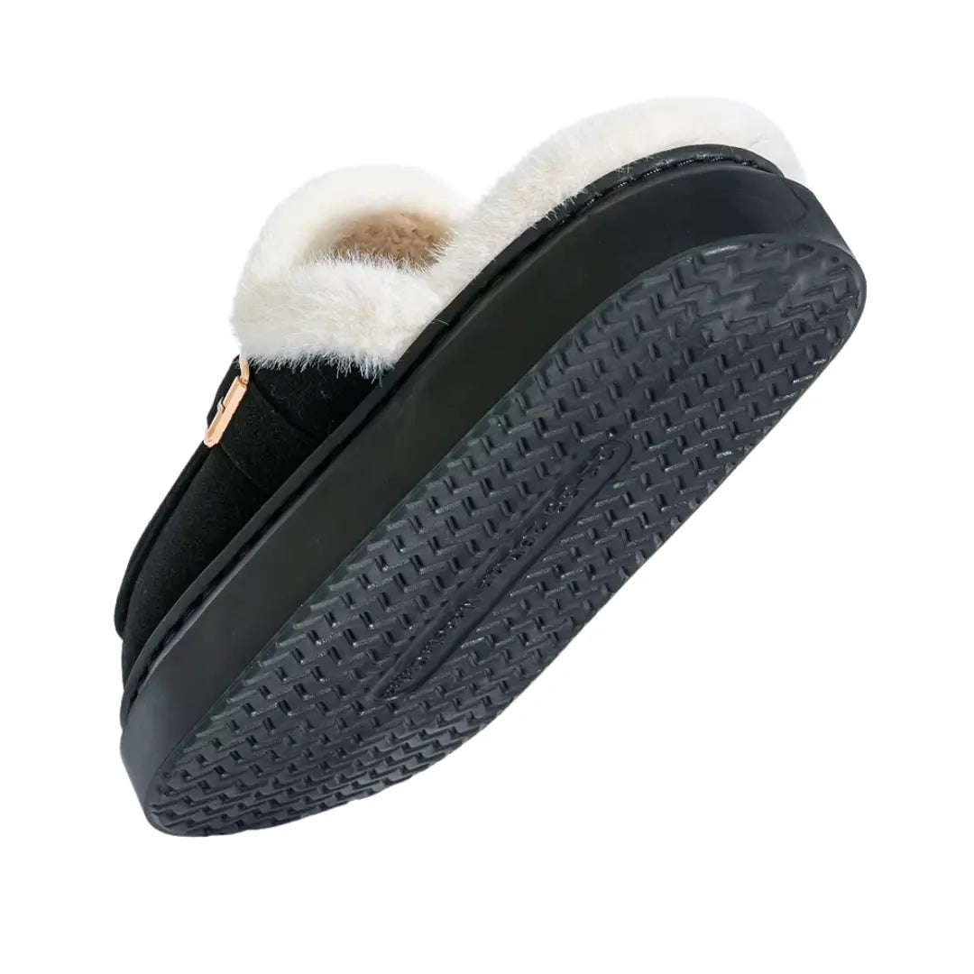 De Noelle sloffen combineren ultiem comfort met een verfijnde uitstraling. De zachte imitatiebontvoering omhult je voeten met warmte, terwijl de suède-look buitenkant en decoratieve metalen gesp een luxueus accent geven. Dankzij de stevige antislip rubberen zool geniet je van stabiliteit op elke ondergrond — perfect voor ontspannen dagen thuis of een snelle stap naar buiten.