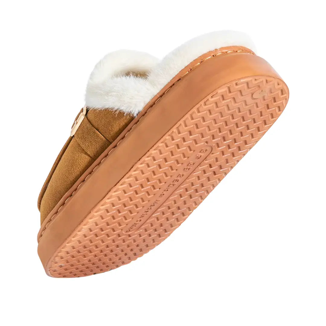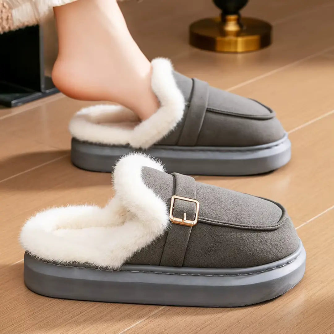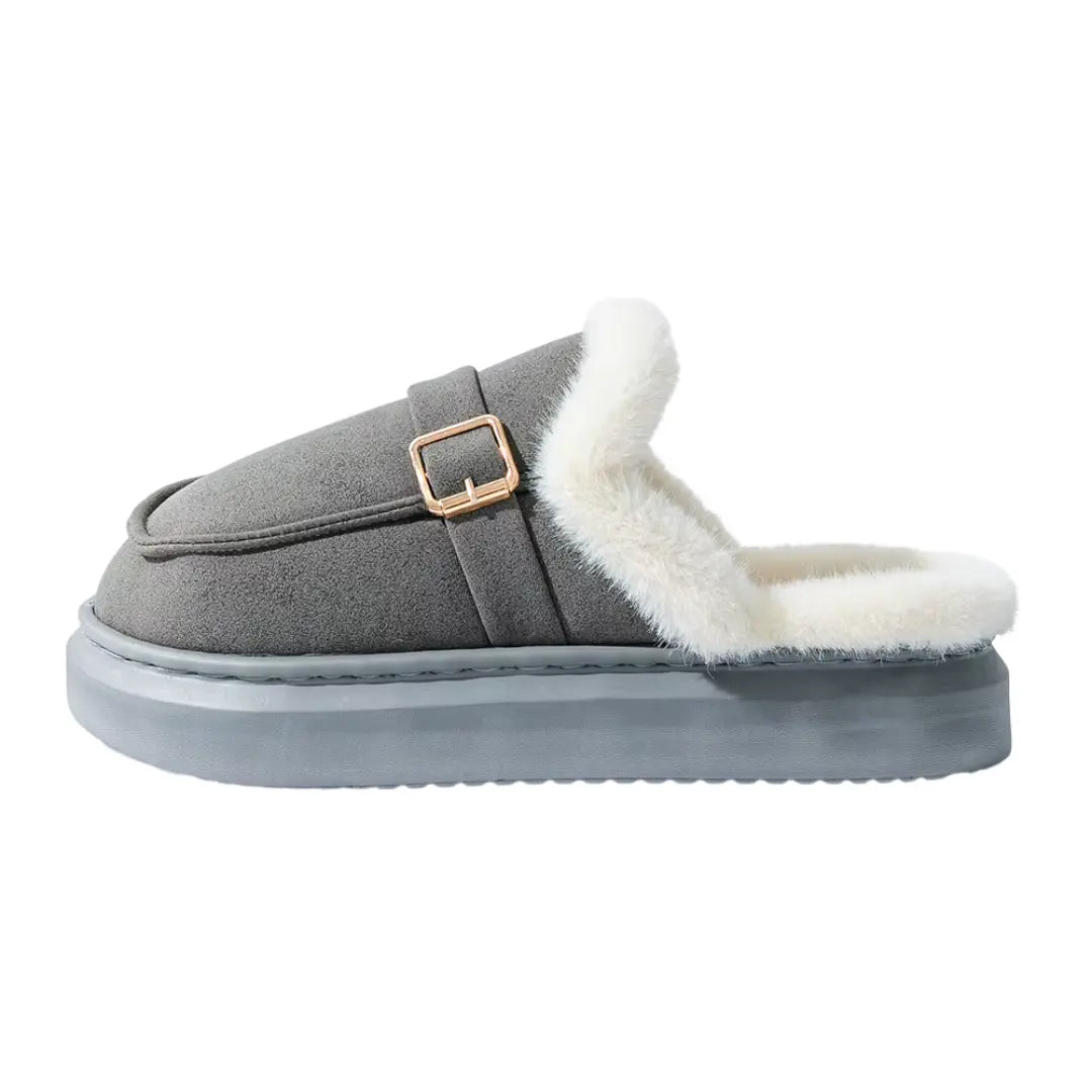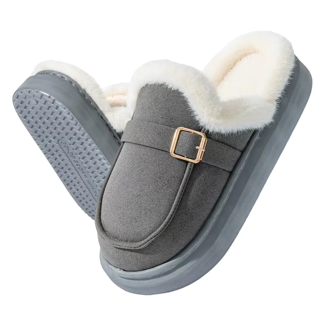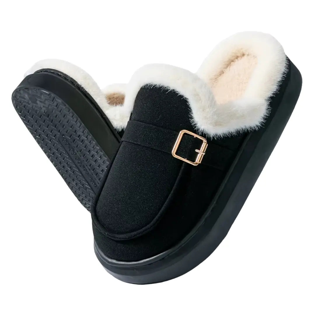 De Noelle sloffen combineren ultiem comfort met een verfijnde uitstraling. De zachte imitatiebontvoering omhult je voeten met warmte, terwijl de suède-look buitenkant en decoratieve metalen gesp een luxueus accent geven. Dankzij de stevige antislip rubberen zool geniet je van stabiliteit op elke ondergrond — perfect voor ontspannen dagen thuis of een snelle stap naar buiten.