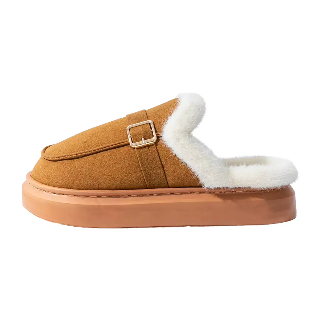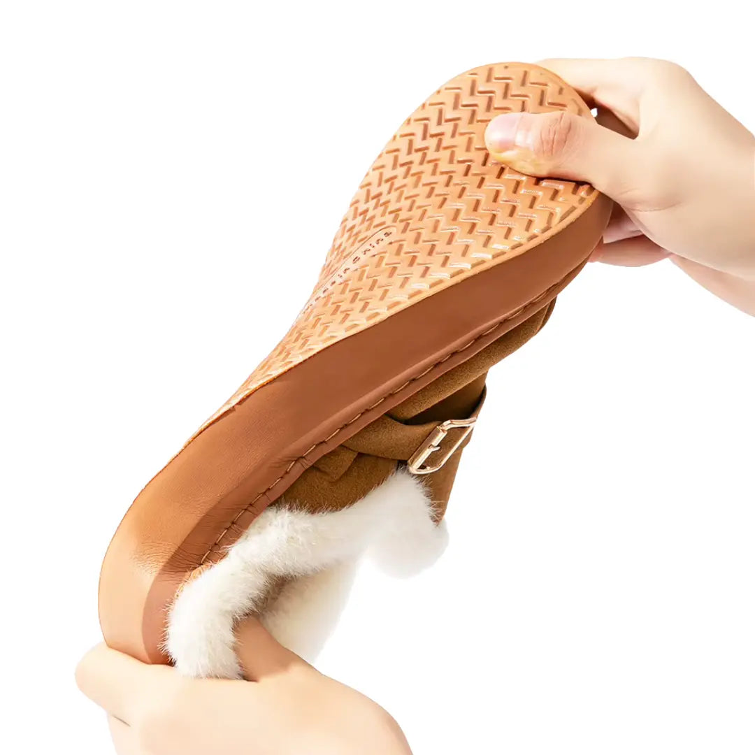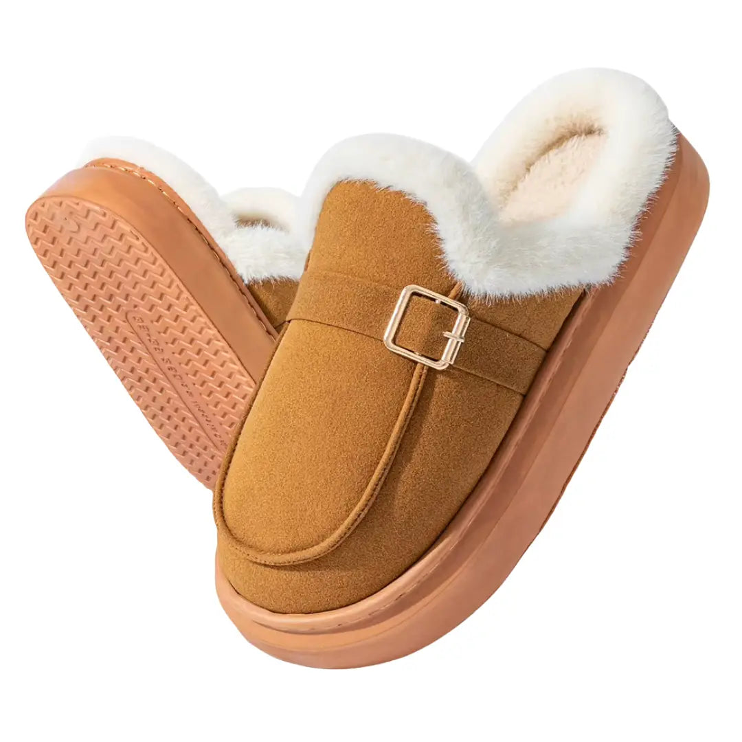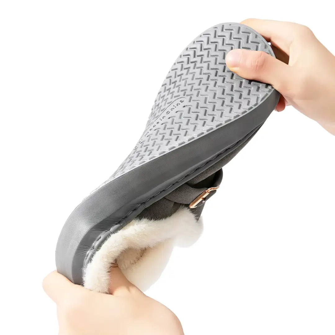 De Noelle sloffen combineren ultiem comfort met een verfijnde uitstraling. De zachte imitatiebontvoering omhult je voeten met warmte, terwijl de suède-look buitenkant en decoratieve metalen gesp een luxueus accent geven. Dankzij de stevige antislip rubberen zool geniet je van stabiliteit op elke ondergrond — perfect voor ontspannen dagen thuis of een snelle stap naar buiten.
