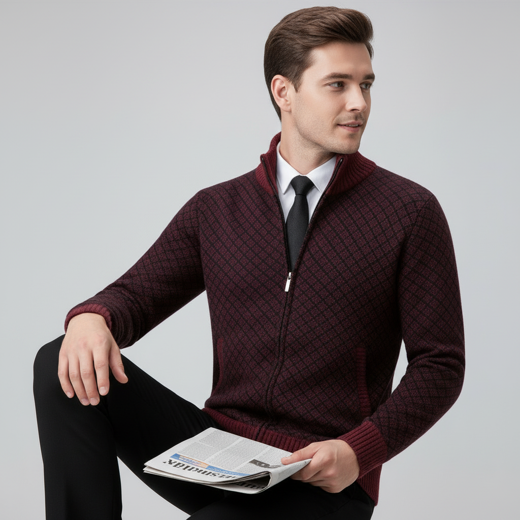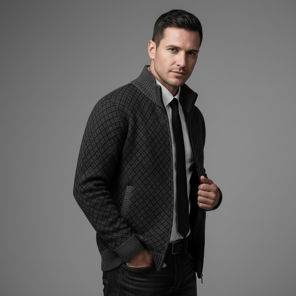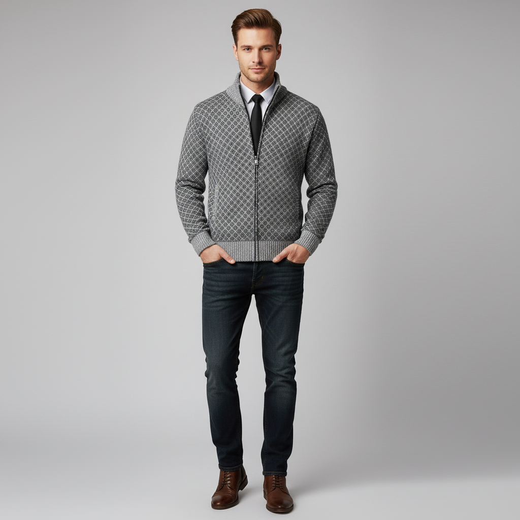 Dit gebreide vest met volledige rits is gemaakt voor mannen die er elke dag representatief uit willen zien. Het fijne geometrische breipatroon, de slanke pasvorm en de opstaande kraag geven direct een luxe, zelfverzekerde uitstraling. Open gedragen oogt het relaxed, gesloten straalt het juist klasse en structuur uit — precies wat je zoekt in een veelzijdig vest.