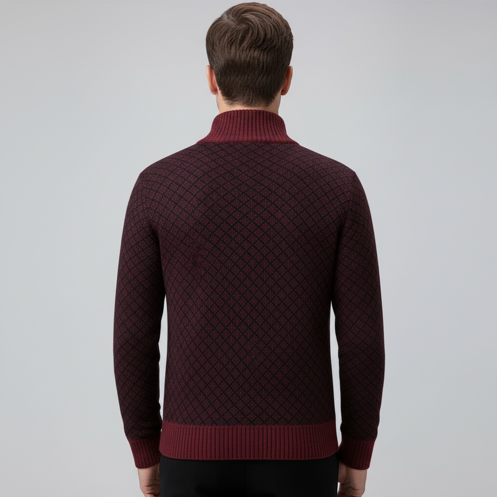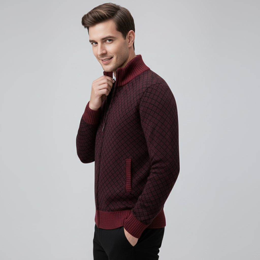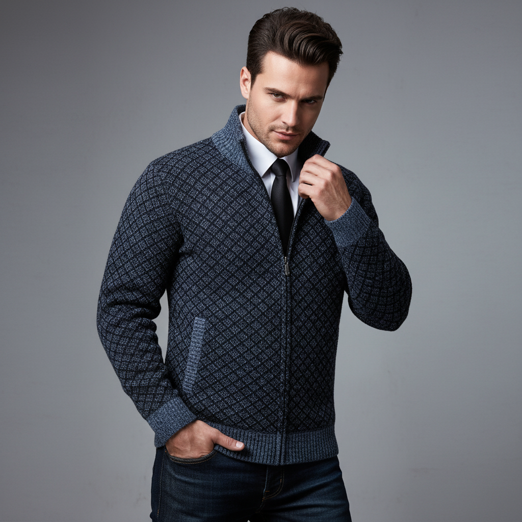 Dit gebreide vest met volledige rits is gemaakt voor mannen die er elke dag representatief uit willen zien. Het fijne geometrische breipatroon, de slanke pasvorm en de opstaande kraag geven direct een luxe, zelfverzekerde uitstraling. Open gedragen oogt het relaxed, gesloten straalt het juist klasse en structuur uit — precies wat je zoekt in een veelzijdig vest.