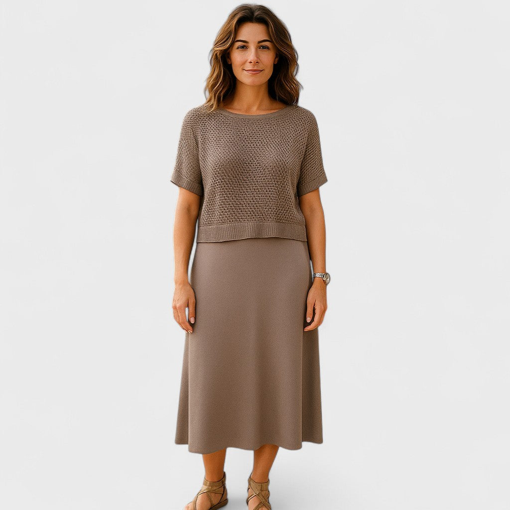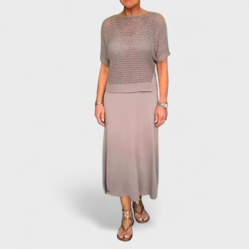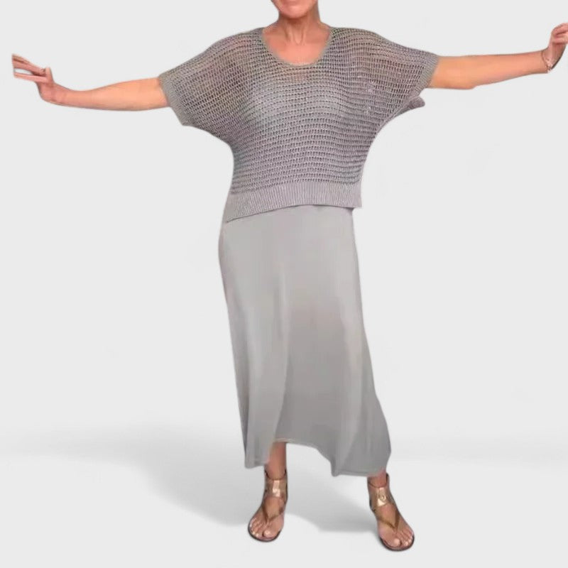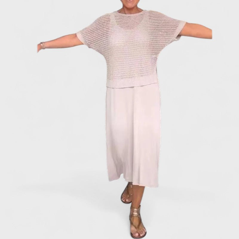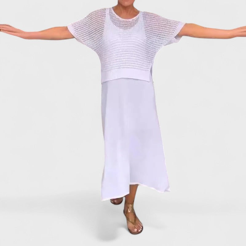 De Solène jurk straalt moeiteloze verfijning uit met haar luchtige silhouet en verfijnde gelaagde ontwerp. De lichte, vloeiende onderlaag valt soepel langs het lichaam, terwijl de gebreide overlay met opengewerkt patroon zorgt voor een stijlvolle, moderne textuur. Dankzij de losvallende pasvorm en wijde korte mouwen biedt de jurk ultiem draagcomfort — perfect voor zonnige dagen of ontspannen diners. Verkrijgbaar in wit, taupe, beige, grijs en zwart.