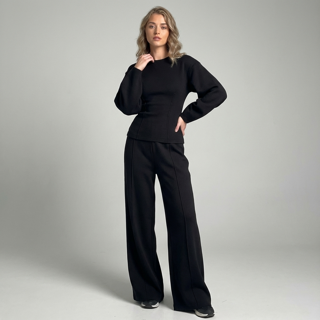 Deze tweedelige dames set is gemaakt voor vrouwen die zich de hele dag comfortabel willen voelen zonder in te leveren op uitstraling. De relaxed sweater en wijde pantalon creëren samen een rustige, moderne look die direct verzorgd oogt. Dit is zo’n outfit die je aantrekt en meteen goed zit — perfect voor thuis, onderweg of een casual afspraak.