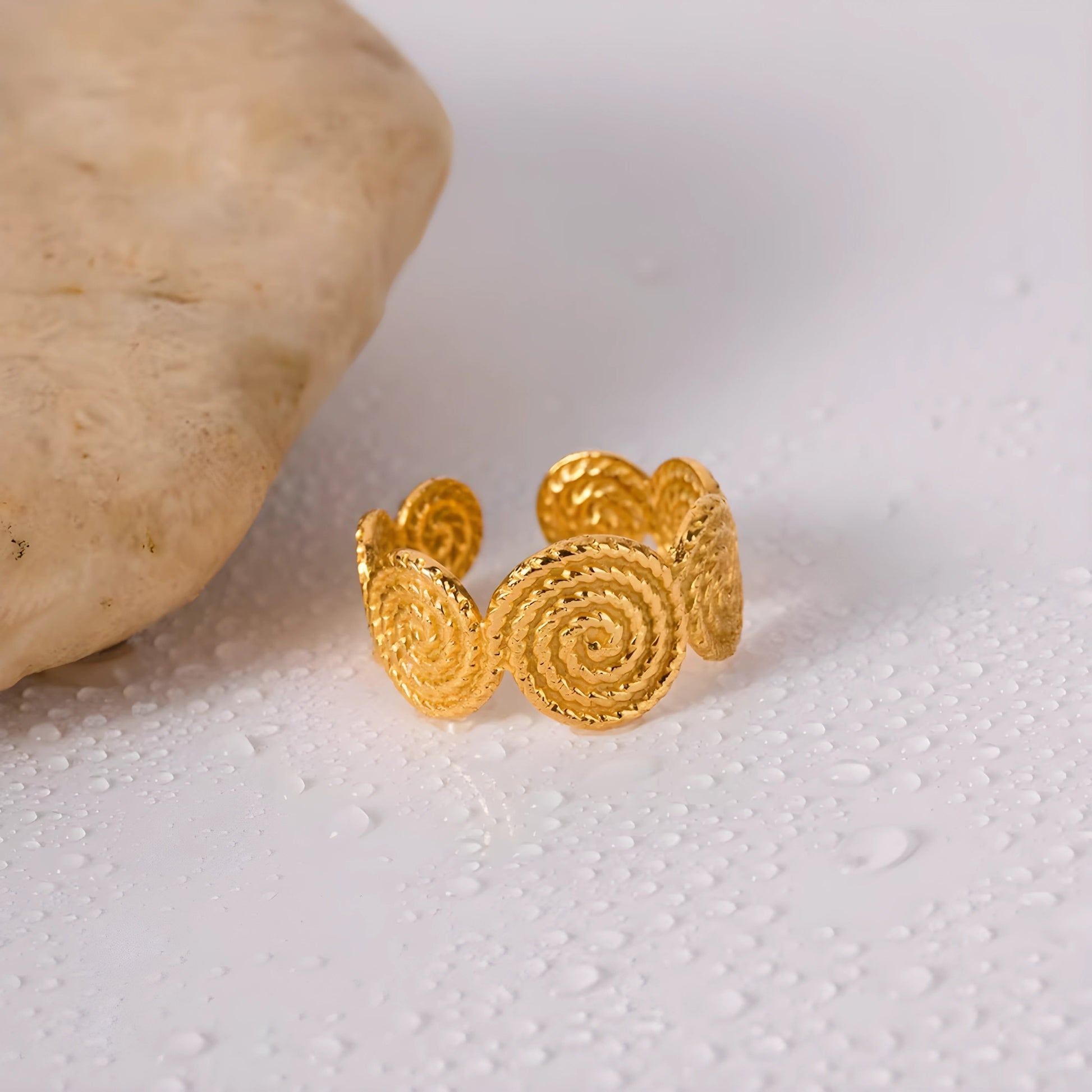 De Sylvette Spiraal Ring is een open, verstelbare damesring met een elegant spiraaldesign en subtiele gehamerde details. Het lichtgewicht, goudkleurige metaal zorgt voor een luxe en moderne uitstraling β ideaal voor dagelijks gebruik of als statement piece.